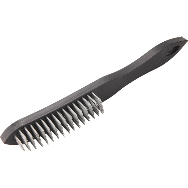 EXTOL PREMIUM drótkefe hajlított, kétkomponensű TPR+műanyag nyél; 4 soros, 28mm szálhossz, acél, hossz: 25cm, fejméret: 27×125mm [ 8803911 ]