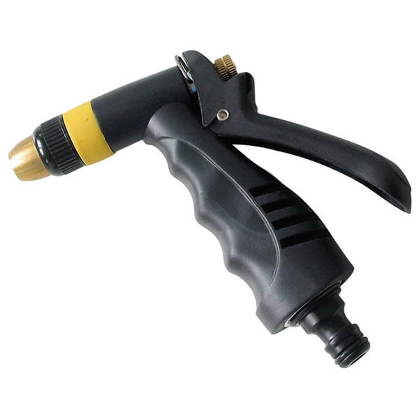 Ergonómikus kialakítású markolat a kényelmes tartás érdekében. A sárgaréz testű és fúvókájú sugárlocsoló rögzíthető a hosszabb ideig tartó permetezés érdekében. A pisztoly gyors felhelyezhető a tömlőre a gyorscsatlakozó segítségével