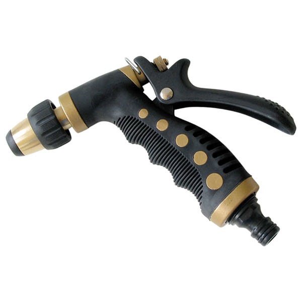 Ergonómikus kialakítású markolat a kényelmes tartás érdekében. A sárgaréz testű és fúvókájú sugárlocsoló rögzíthető a hosszabb ideig tartó permetezés érdekében. A pisztoly gyors felhelyezhető a tömlőre a gyorscsatlakozó segítségével