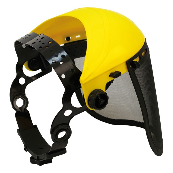 Egész arcot védő, fejpántos dróthálos pajzs, EN 1731. Láncfűrészes vágás vagy egy fejszés aprítás alkalmával, védi a fejet repülő forgácsoktól vagy bozótvágó használatakor repülő apró kövektől, jól szellőző.