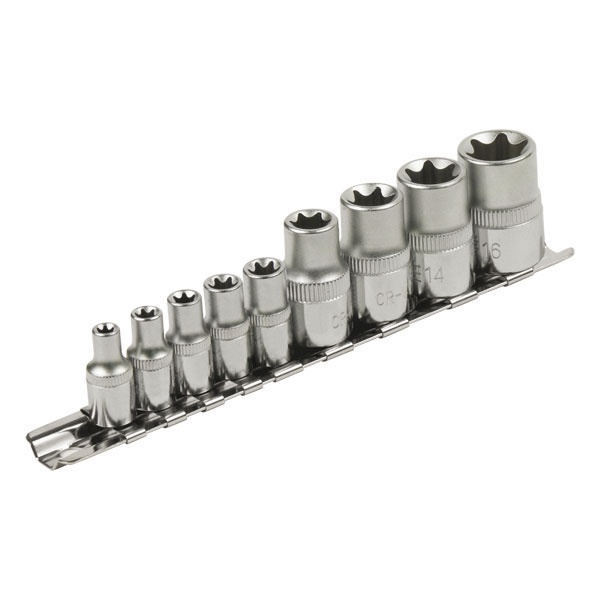 EXTOL PREMIUM dugófej klt., E-TORX; 1/4″×5db (E5-E6-E7-E8-E10), 1/2″×4db, (E12-E14-E16-E18), tartó sínen [ 8818114 ]