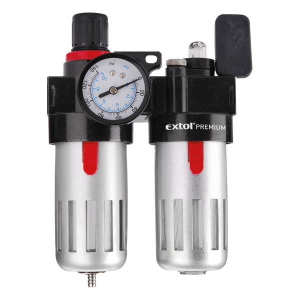 EXTOL PREMIUM levegőelőkészítő (légszűrő nyomásszabályozóval, olajozóval ésmanométerrel),max.8Bar,1/4″,max.60°C,90ml szűrő olajzó [ 8865105 ]