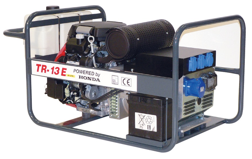 A HONDA TR-13E AVR benzinmotoros áramfejlesztők kiválóan alkalmasak építési munkahelyek áramellátására, hálózati feszültség pótlására. A HONDA GX-630 benzinmotor igen hosszú élettartamot és gazdaságos üzemeltetést biztosít. A HONDA TR-13E AVR benzinmotoros áramfejlesztő kedvező az üzemanyagfogyasztása, csekély a karbantartási igénye, valamint a szerviz- és alkatrészellátottság is kiváló. Üzemanyaga 95-ös oktánszámú ólommentes benzin, a fordulatszám 3000 /perc. A fogyasztási adatok teljes terhelésre vonatkoznak, a gyakorlatban a fogyasztás a megadatoktól lényegesen kisebb. A gép alapkeretre szerelt, burkolatlan kivitelű. A zajszint 95 dB alatt van. A védettség IP23.