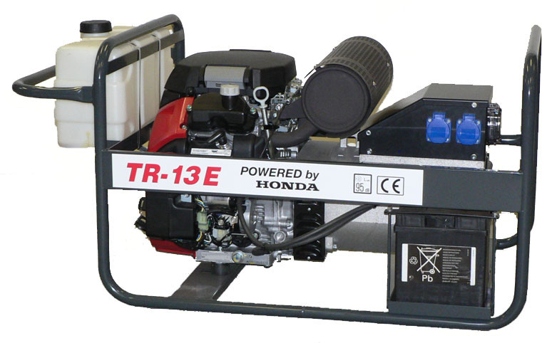 A HONDA TR-13E benzinmotoros áramfejlesztők kiválóan alkalmasak építési munkahelyek áramellátására, hálózati feszültség pótlására. A HONDA benzinmotor igen hosszú élettartamot és gazdaságos üzemeltetést biztosít. A HONDA TR-13E kedvező az üzemanyagfogyasztása, csekély a karbantartási igénye, valamint a szerviz- és alkatrészellátottság is kiváló. Üzemanyaga 95-ös oktánszámú ólommentes benzin, a fordulatszám 3000 /perc. A fogyasztási adatok teljes terhelésre vonatkoznak, a gyakorlatban a fogyasztás a megadatoktól lényegesen kisebb. A gép alapkeretre szerelt, burkolatlan kivitelű. A zajszint 95 dB alatt van. A védettség IP23.