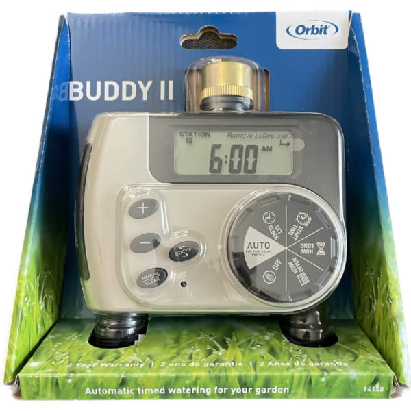 Az Orbit Buddy II 2 zónás digitális időzítő használatával percek alatt programozott öntözőrendszerré alakítható a kerti csap. Kiváló minőségű anyagokból készült, vízálló konstrukció. A tárcsa lehetővé teszi az időzítő teljes vezérlését.